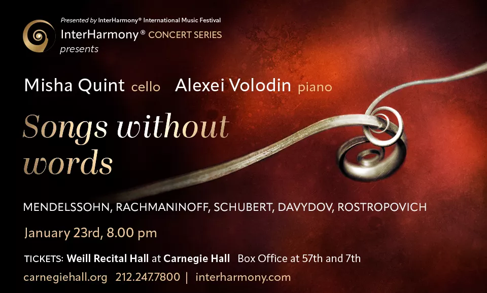 InterHarmony® Concert Series returns to Carnegie Hall on January 23 with Songs Without Words, featuring cellist Misha Quint and pianist Alexei Volodin. Two virtuosos reunite for a concert framed around the simple idea: music doesn't need lyrics for the highest expression.